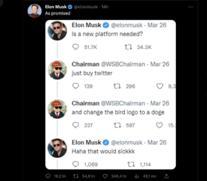 و تسببت حركة إيلون ماسك وشركة “تويتر” باستبدال صورة العصفور الأزرق بشعار عملته الرقمية المفضلة “دوج كوين” في ارتفاع قياسي بقيمتها، حيث ارتفعت بأكثر من 25% خلال الـ 24 ساعة الماضية. وفي أعقاب تغيير شعار “تويتر”، غرد إيلون ماسك، مالك المنصة، قائلا: كما وعد !